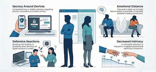 Early signs include secrecy, emotional withdrawal, and reduced intimacy.
